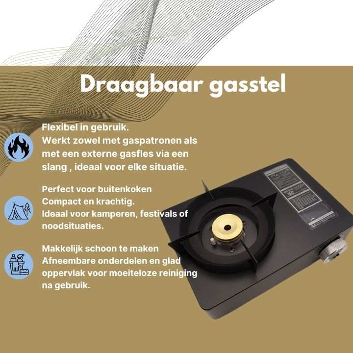 Draagbaar gasstel voor FOLLESA® Noodpakket, flexibel kooktoestel geschikt voor gaspatronen en externe gasflessen, ideaal voor kamperen, festivals en noodsituaties.