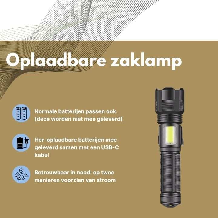 Oplaadbare zaklamp met USB-C kabel en batterijen, betrouwbaar noodverlichting onderdeel van FOLLESA® Noodpakket
