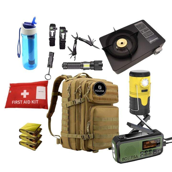 FOLLESA® Noodpakket survival kit with durable backpack, emergency radio, gas stove, flashlight, water filter bottle, first aid kit, thermal blankets, and multifunctional tools