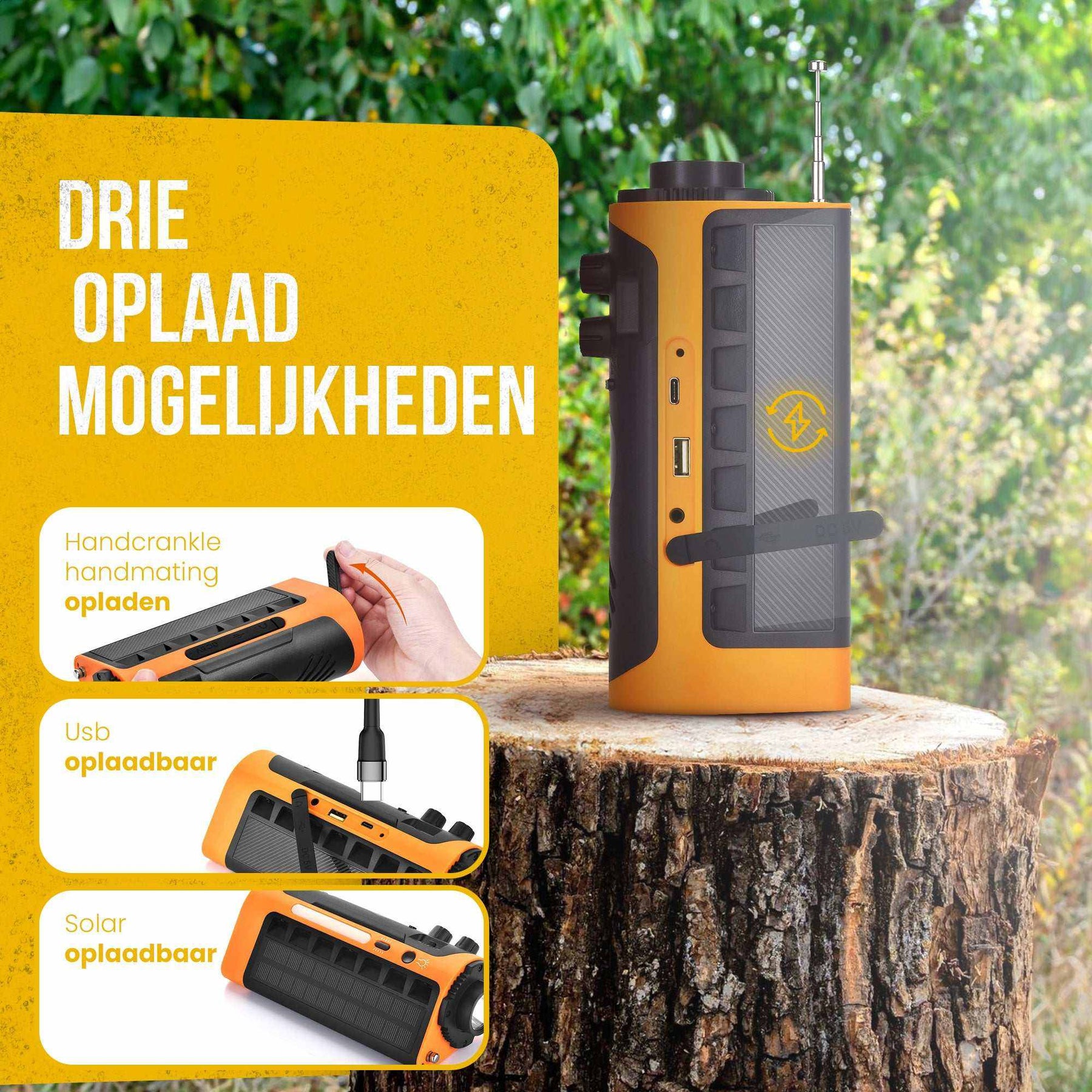 De noodradio van Follesa is oplaadbaar via verschillende methoden, zoals solar energie, handcrackle, USB en USB-C poorten. Hierdoor kun je de radio altijd en overal gemakkelijk opladen, zelfs in noodsituaties waarbij normale stroomvoorzieningen niet beschikbaar zijn.